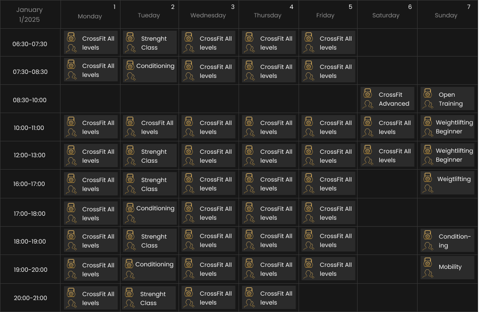 We offer a wide variety of classes every week, tailored to different skill levels—from beginners to advanced athletes. There’s something for everyone, no matter where you are on your fitness journey!